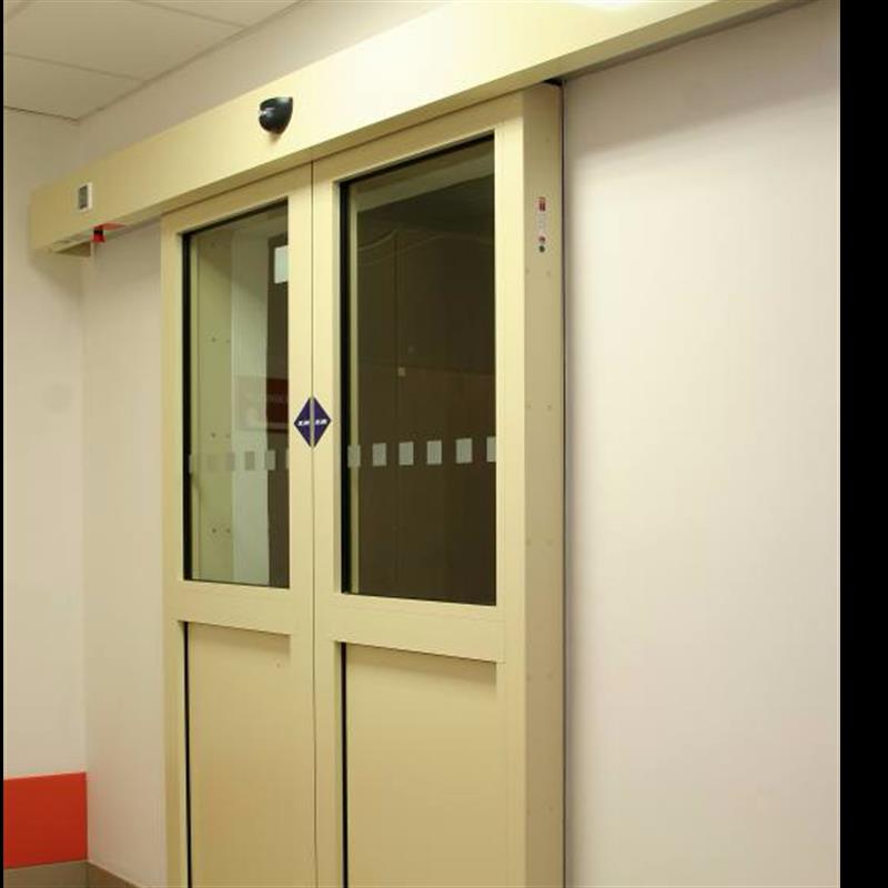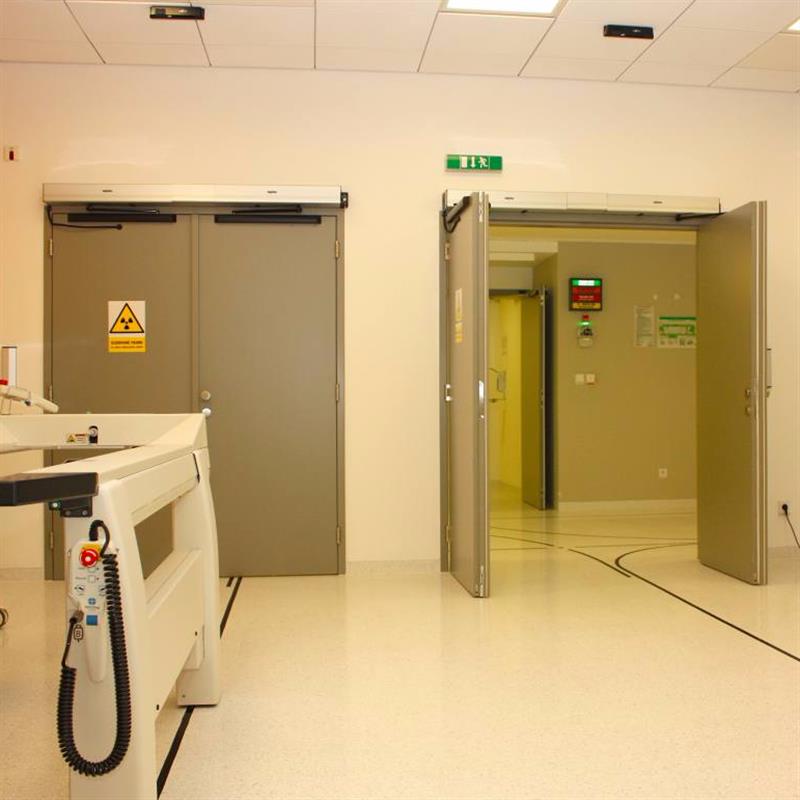 Na špeciálnych pracoviskách protónového centra boli inštalované dvojkrídlové otočné protipožiarne automatické dvere, vybavené otočnými pohonmi EMSW. Každé dverné krídlo musí mať svoj pohon, preto dvojkrídlové otočné dvere obsahujú pohony dva. Oba sú vizuálne spojené stredovým segmentom do jedného celku.